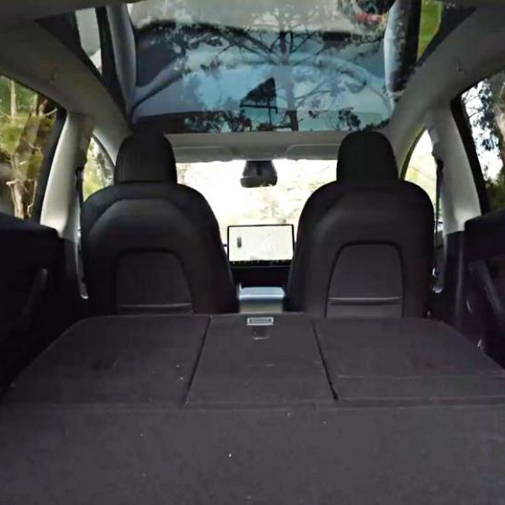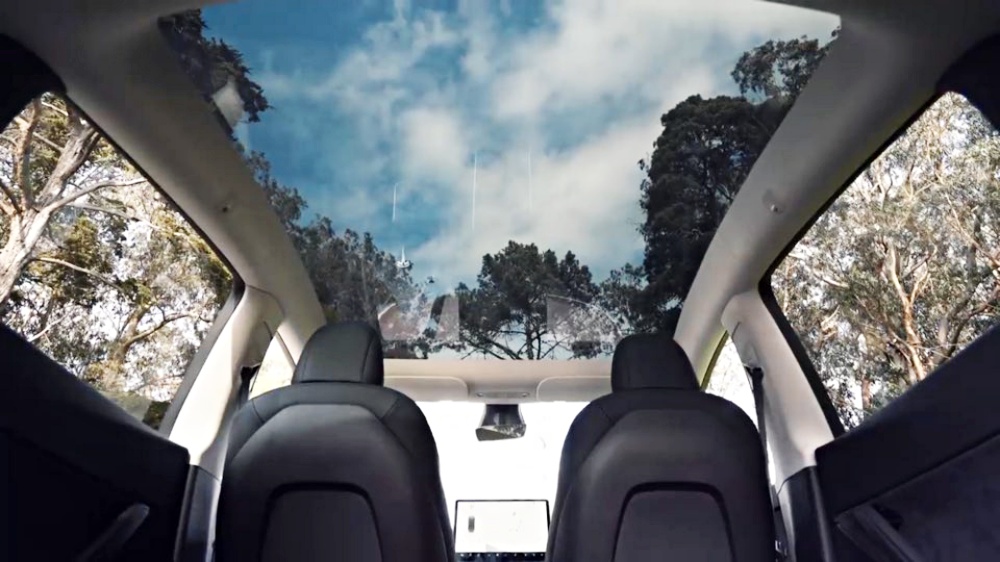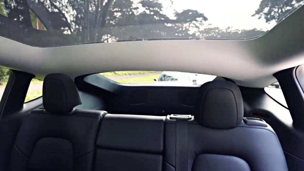 테슬라 모델y 실내 뒷공간에서 앉자마자 보이는 건 파노라마 천장입니다 실내공간이 더 넓어진 느낌을 주며, 차박을 할 때도 하늘을 볼 수 있어요